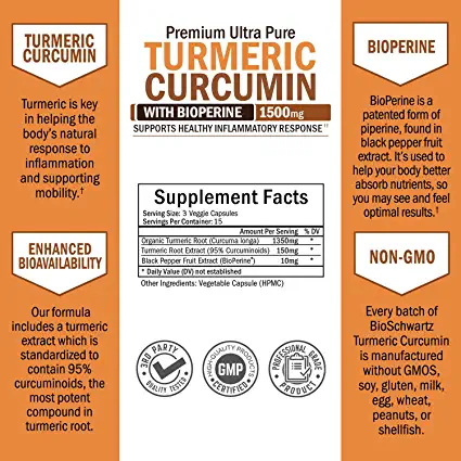 180 Viên nghệ hiệu quả cao tăng cường bioperine: Công thức nghệ BioSchwartz có 1500mg curcumin nghệ với 95% curcuminoids tiêu chuẩn hóa trên mỗi khẩu phần (hiệu lực cao) và 10mg bioperine (tiêu đen, curcumin với tiêu đen) giúp tăng cường khả năng hấp thụ và sinh học