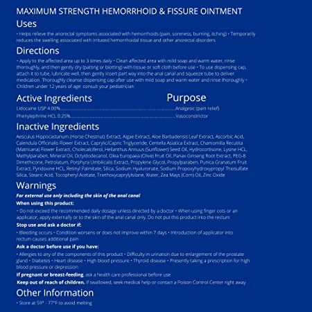 Lidocaine USP 4,0% Thuốc giảm đau (giảm đau), Phenylephrine HCl 0,25% (thuốc co mạch), Chiết xuất Aesculus Hippocastanum (Hạt dẻ ngựa), Chiết xuất Algea, Chiết xuất lá lô hội, Axit ascorbic, Chiết xuất hoa Calendula Officinalis, Caprylic/Capric Triglyceride, Chiết xuất Centella Asiatica , Chiết xuất hoa Chamomilla Recutita (Matricaria), Cholecalciferol, Dầu hạt Helianthus Annuus (Hướng dương), Hydrocortisone, Lysine HCl, Methylparaben, Dầu khoáng, Octyldodecanol, Dầu trái cây Olea Europaea (Olive), Chiết xuất rễ nhân sâm Panax, PEG-8 Dimethicone, Petrolatum , Chiết xuất porphyra Umbilicalis, Propylene Glycol, Propylparaben, Chiết xuất từ quả Punica Granatum, Pyridoxine HCl, Retinyl Palmitate, Silica, Natri Hyaluronate, Natri Propoxyhydroxypropyl Thiosulfate Silica, Axit Stearic, Tocopheryl Acetate, Triethoxycaprylylsilane, Nước, Dầu ngô, Oxit kẽm.